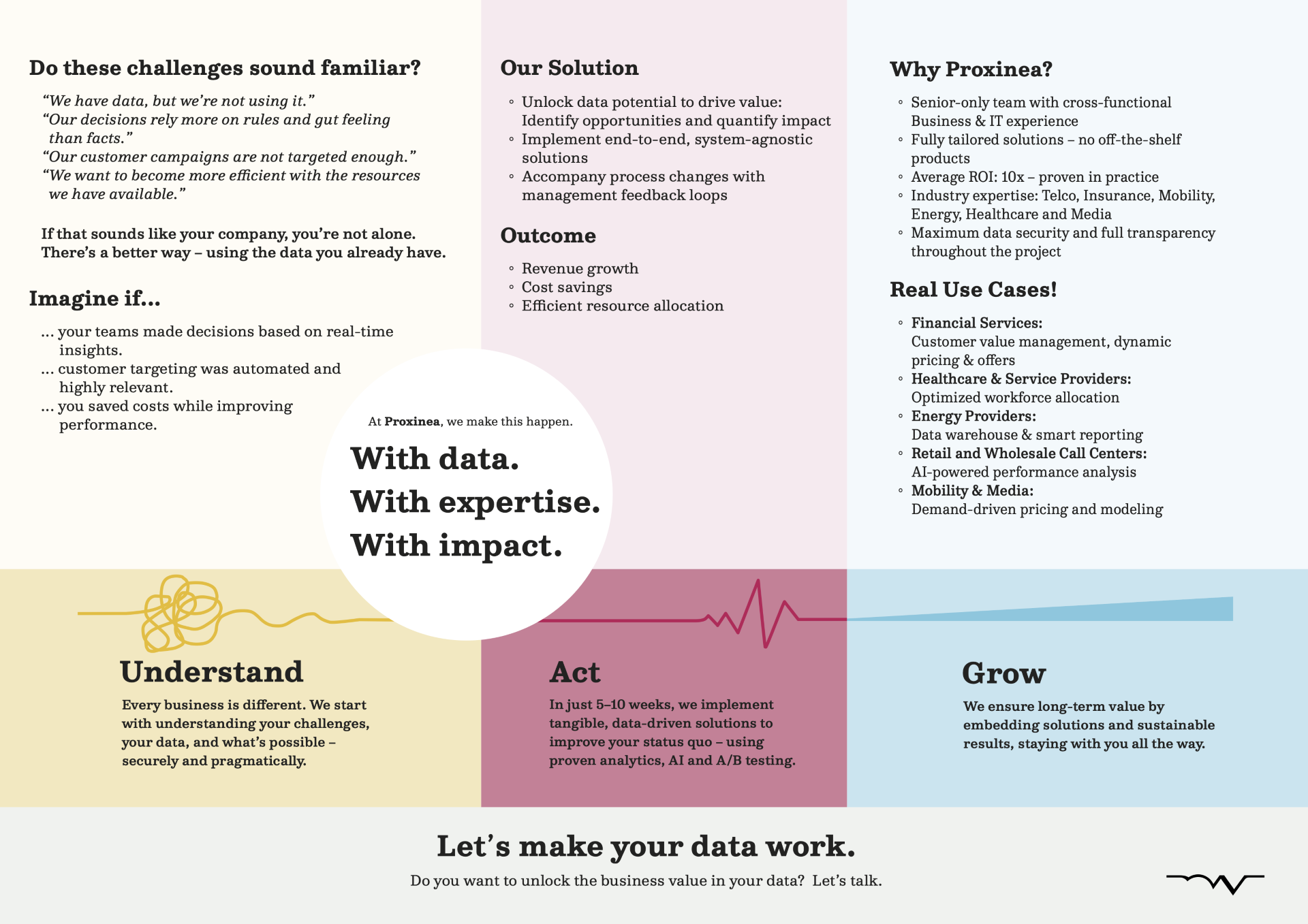 Proxinea is your partner on the journey towards a data driven company by giving you access to state-of-the-art Data Science services. We support you all the way from consulting on data and AI strategy to implementation and operation of tailor-made Machine Learning solutions.